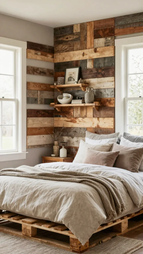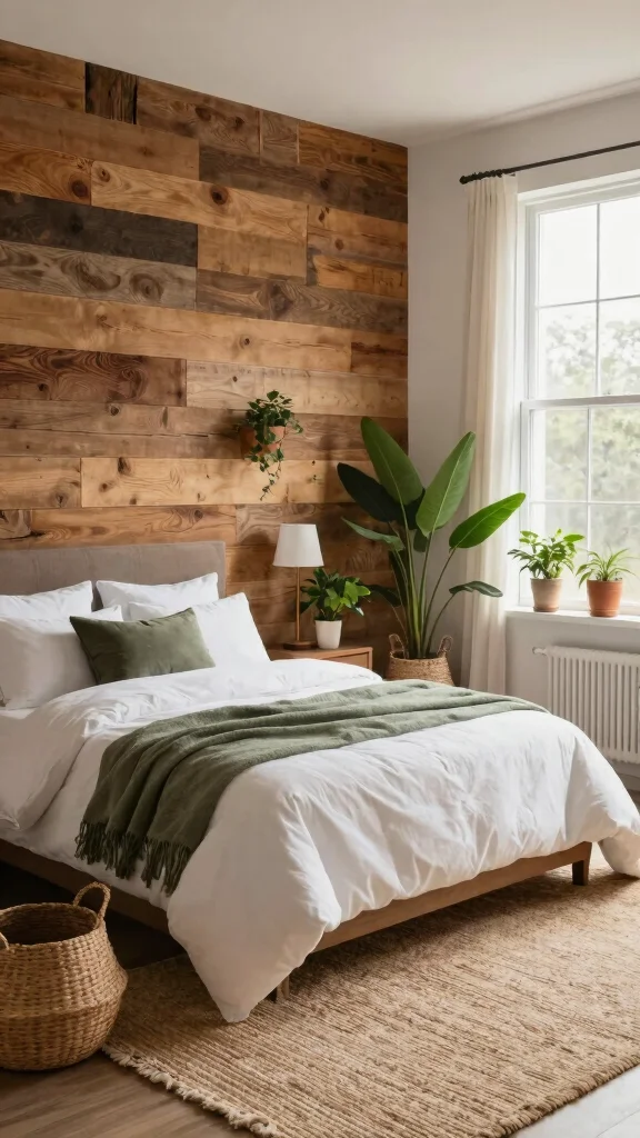 Incorporate earthy tones with reclaimed wood to create a sustainable and warm accent wall in your bedroom.