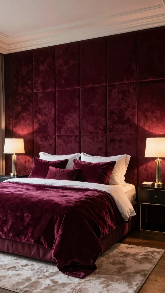 The rich texture provides depth while also offering sound insulation, making your bedroom a peaceful retreat. Pairing velvet with soft lighting and metallic accents enhances the overall opulence of the space.