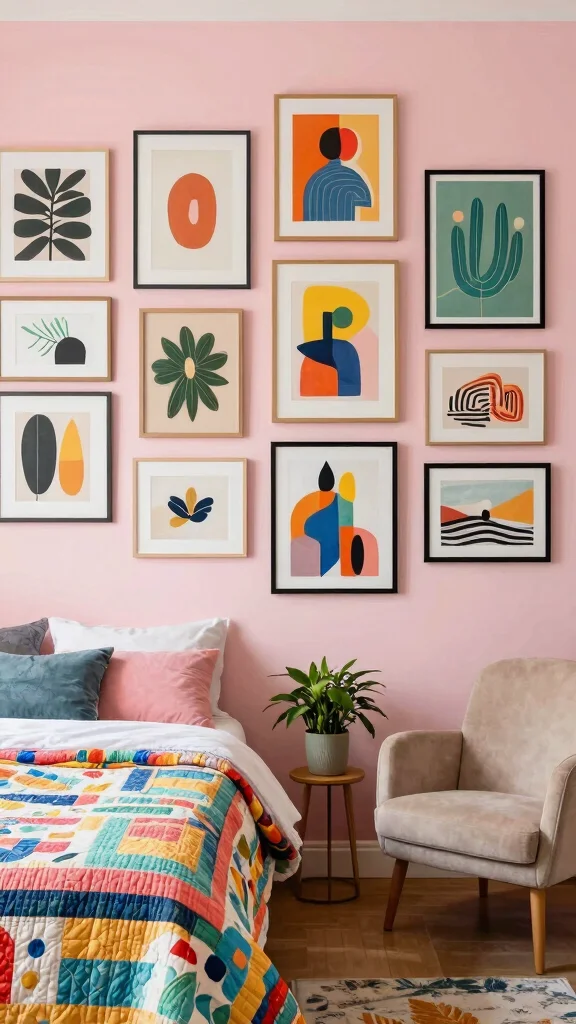 Design an eclectic gallery wall with art and photos to create a personalized focal point in your bedroom.
