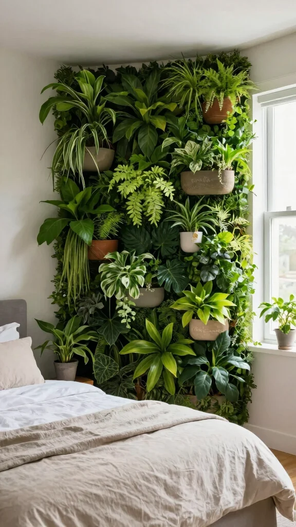 Transform a wall into a vertical garden to bring nature indoors and enhance your bedroom’s ambiance.