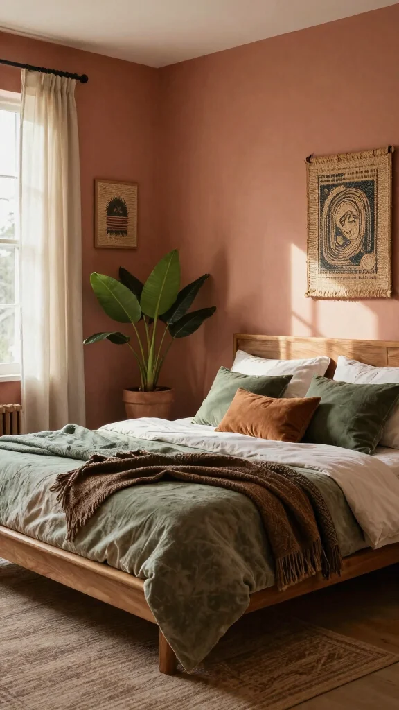 – Pair soft terracotta walls with a rustic wooden bed frame