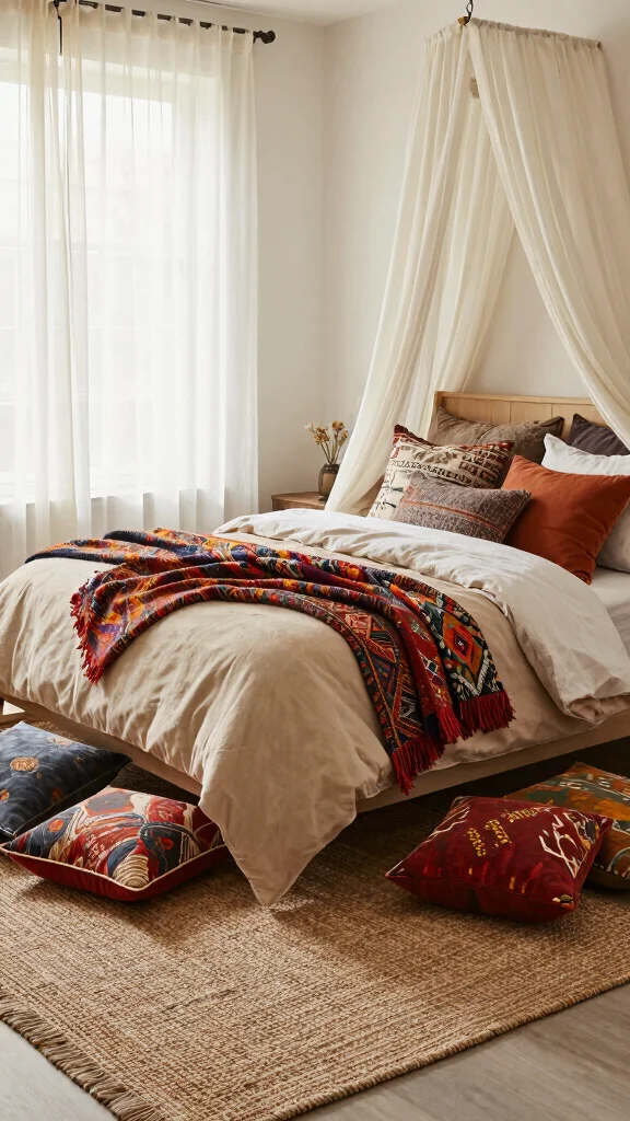 A canopy can instantly transform your bed into a dreamy centerpiece. By draping soft fabrics, you create an ethereal vibe that enhances the bohemian aesthetic while offering styling versatility.