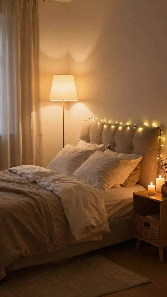 Consider using string lights or fairy lights around your bed frame for a whimsical touch. Floor lamps that provide diffused lighting can help create a warm glow throughout the room. Candles of varying heights can further enhance the intimate ambiance you’re aiming for.