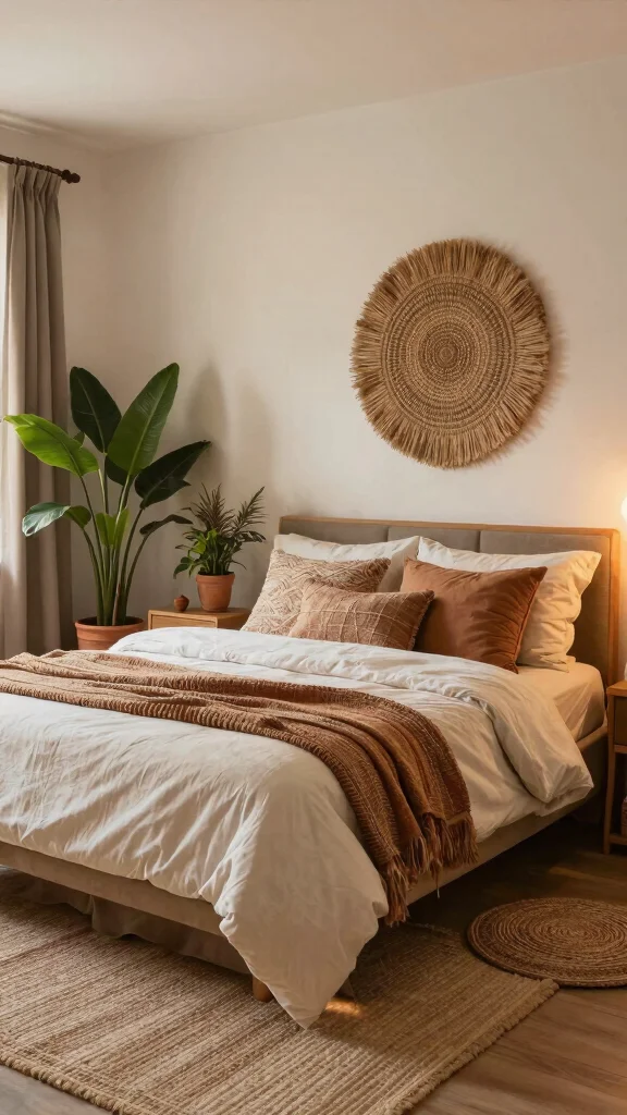 To nail aesthetic bedroom ideas for a Bohemian-inspired space, start with a warm, earthy palette and layer textures. Use a neutral base like creams and sand, then add rich accents with cushions, throws, and wall textiles. Bring in natural materials—rattan, wicker, jute—and hang a macramé wall piece or a woven tapestry to set the boho mood.