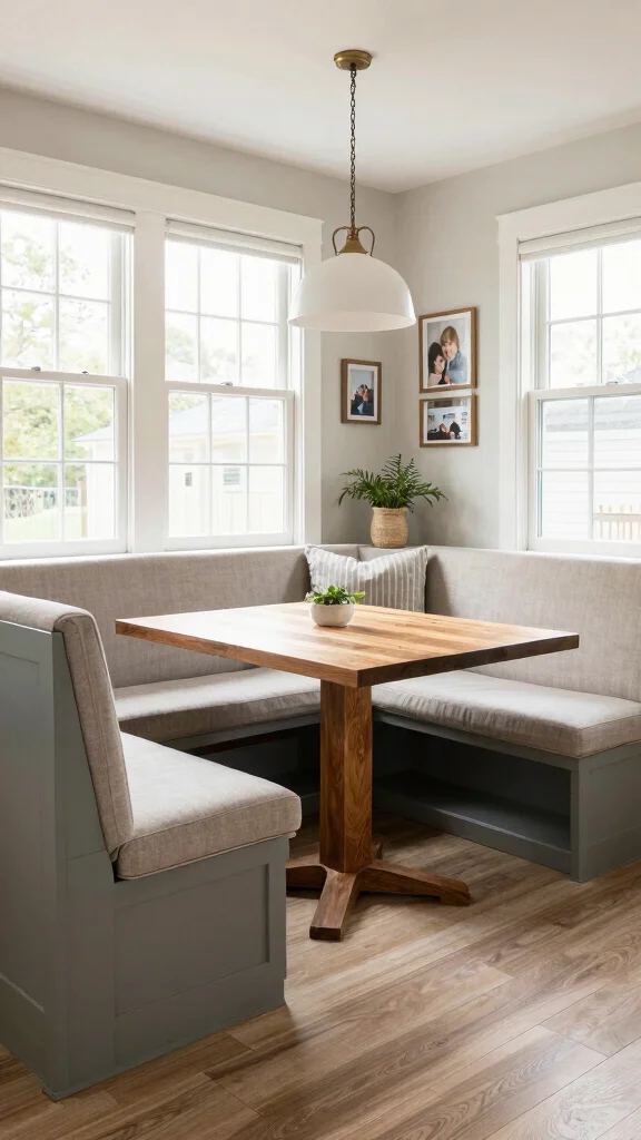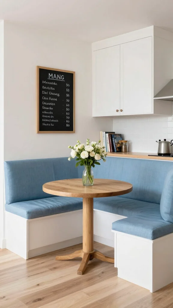 Consider an L-shaped banquette around a corner or a slim straight bench against a wall to maximize floor space. Build the bench with hidden storage under the seat to turn every inch into usable small kitchen furniture storage, keeping your kitchen nook ideas tidy.