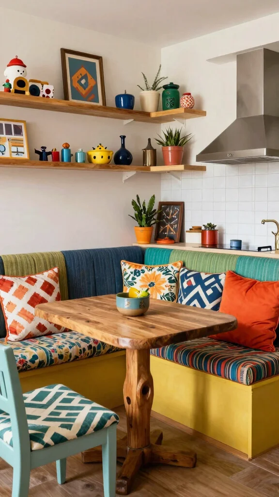 An eclectic banquette can beautifully express your personal style, creating a lively and inspiring kitchen space where every meal feels like an adventure.