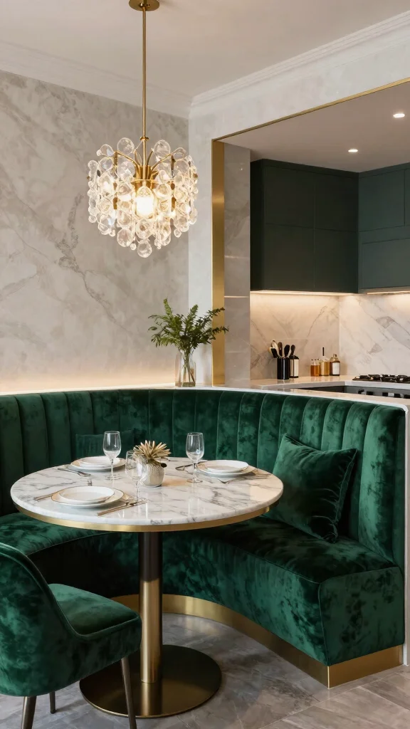 Pairing a velvet banquette with sleek metallic accents amplifies the overall design. Adding plush cushions and a stylish table can further enhance the luxurious feel. A chic light fixture above the banquette can transform this area into a stunning focal point.