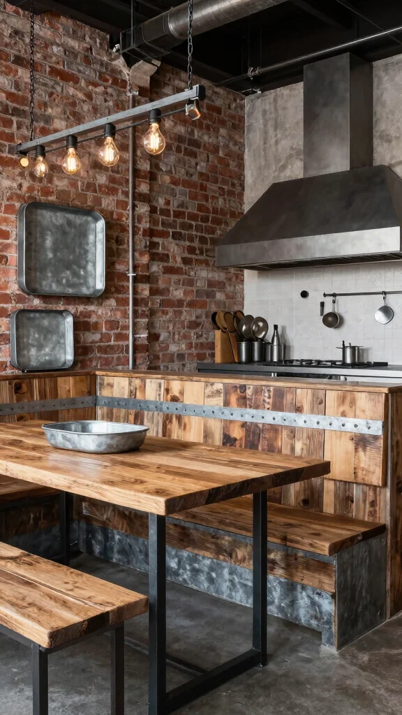 An industrial-style banquette embodies trendy charm that resonates with urban living, offering a stylish yet comfortable dining experience.