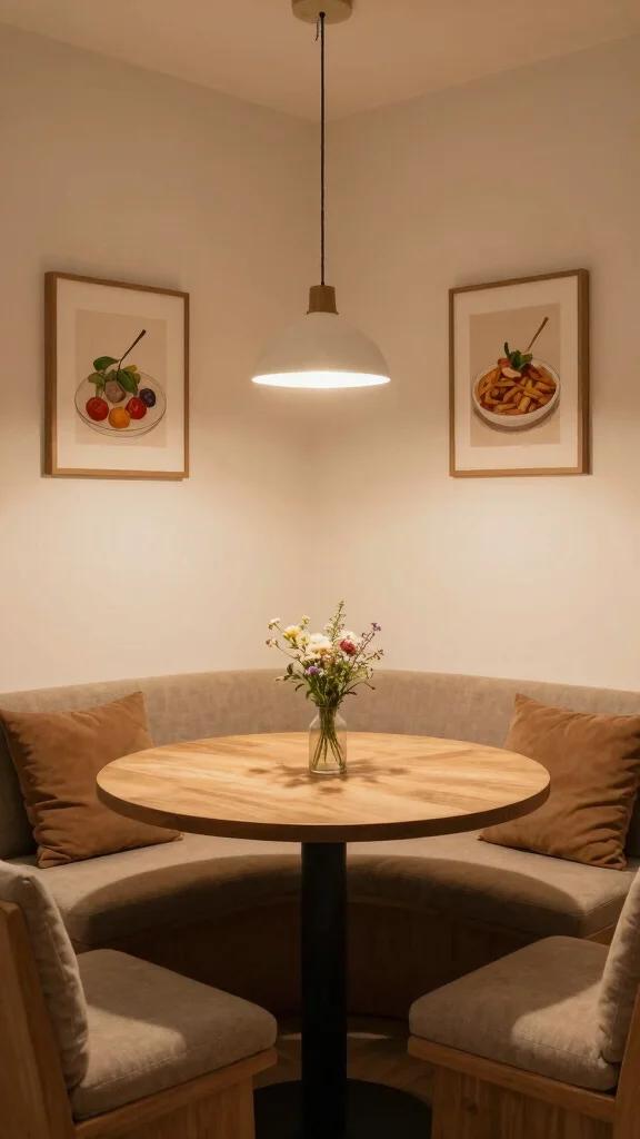 Choose a round table that fits proportionally with your banquette to achieve a balanced appearance. An oversized pendant light above the table can draw the eye upward, enhancing the entire nook’s aesthetic.