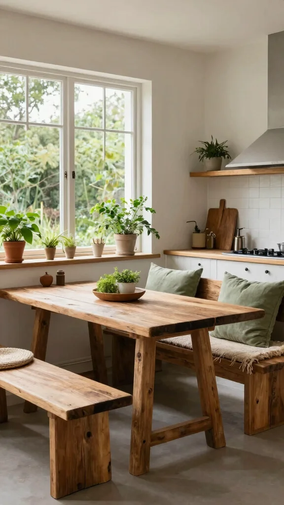 Invite a slice of nature indoors with a banquette crafted from natural materials like wood and rattan. This design brings a sense of calm and tranquility, transforming your kitchen into a serene retreat. Incorporating plants, whether real or faux, enhances this outdoor-inspired look, creating a refreshing dining atmosphere.