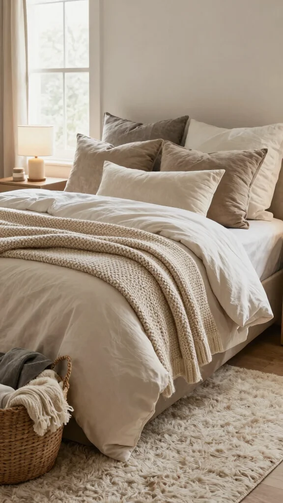 Layer natural textiles (linen, cotton, wool) in warm tones to create cozy bedroom aesthetics within a minimalist bedroom themes framework.