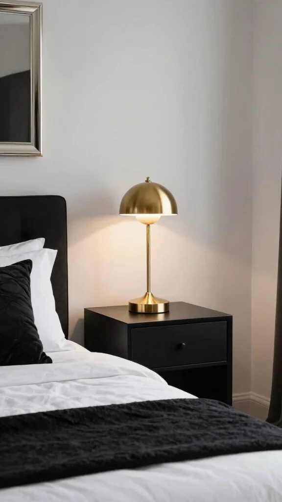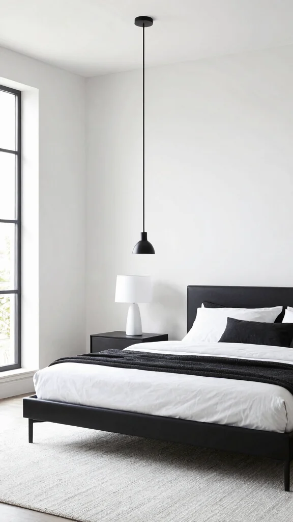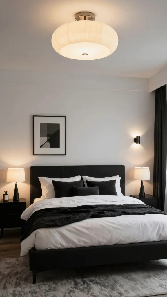 Layered lighting techniques can transform a stark space into a warm, welcoming environment, making your black and white bedroom more inviting.
