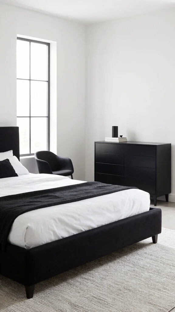 Fun fact: bold black furniture can anchor black and white bedroom ideas, making the space feel 40% more cohesive in under 30 minutes of styling. Pair with light textiles and metallic accents for a timeless, modern look.