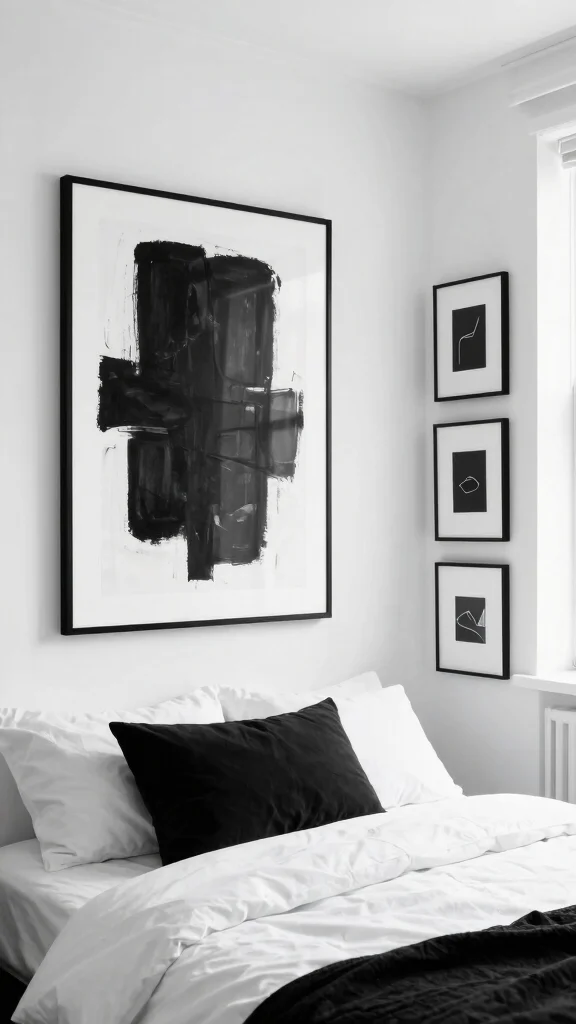 Minimalist wall art can dramatically enhance a black and white bedroom, providing elegance without overwhelming the space. Look for prints featuring simple shapes and abstract forms in monochrome, as these can add sophistication. A gallery wall with framed prints or a prominent single piece can serve as a focal point while reflecting your personal style.