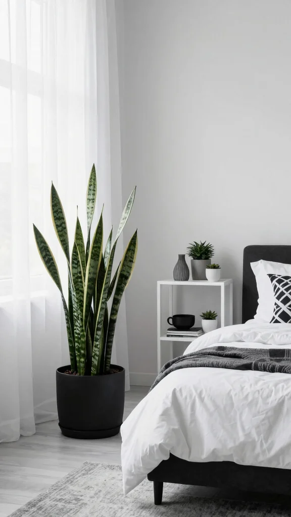 Integrating natural elements can soften the starkness of black and white decor, creating a more inviting atmosphere. Adding plants to your bedroom not only infuses a touch of color but also promotes tranquility. Opt for simple black or white pots to maintain the monochromatic theme while allowing greenery to shine.