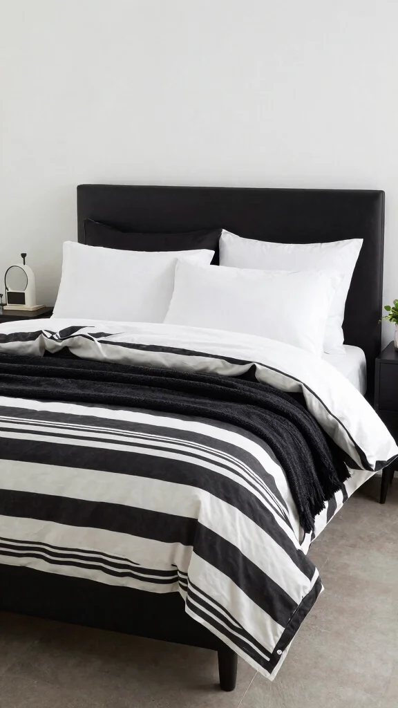 Bedding is essential in establishing the aesthetic of a black and white bedroom. Choosing chic bedding can significantly influence the overall vibe of your space. For instance, a black and white striped duvet cover can introduce a playful yet sophisticated touch, while a minimalist white set offers a clean, modern look.