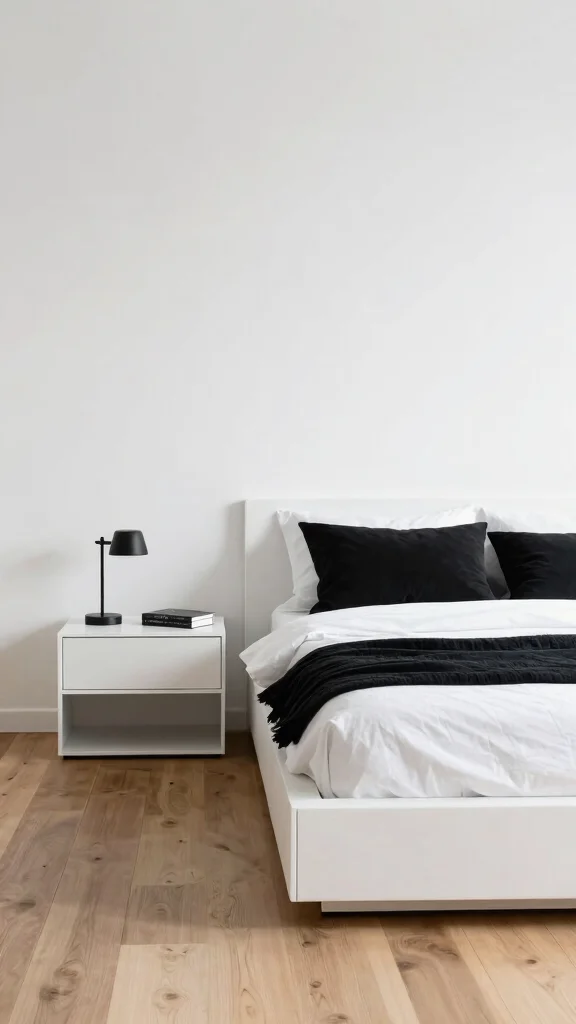 Functional minimalist design focuses on practicality while maintaining a clean aesthetic, making it ideal for a black and white bedroom. This design philosophy encourages you to keep only what is necessary and meaningful, allowing your space to feel open and serene. By selecting functional furniture, such as a platform bed with built-in storage, you can keep your room organized and stylish.
