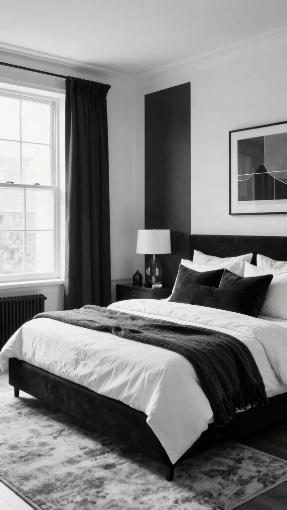 In a black and white bedroom, bold black furniture can make a striking statement. A solid black bed frame or a sleek black dresser adds sophistication without feeling overwhelming. Choosing pieces with clean lines creates a modern look, allowing the furniture to stand out against lighter textiles and decor, enhancing the inviting atmosphere.