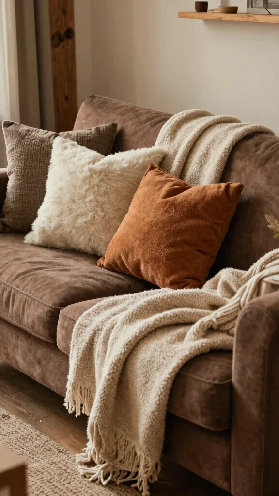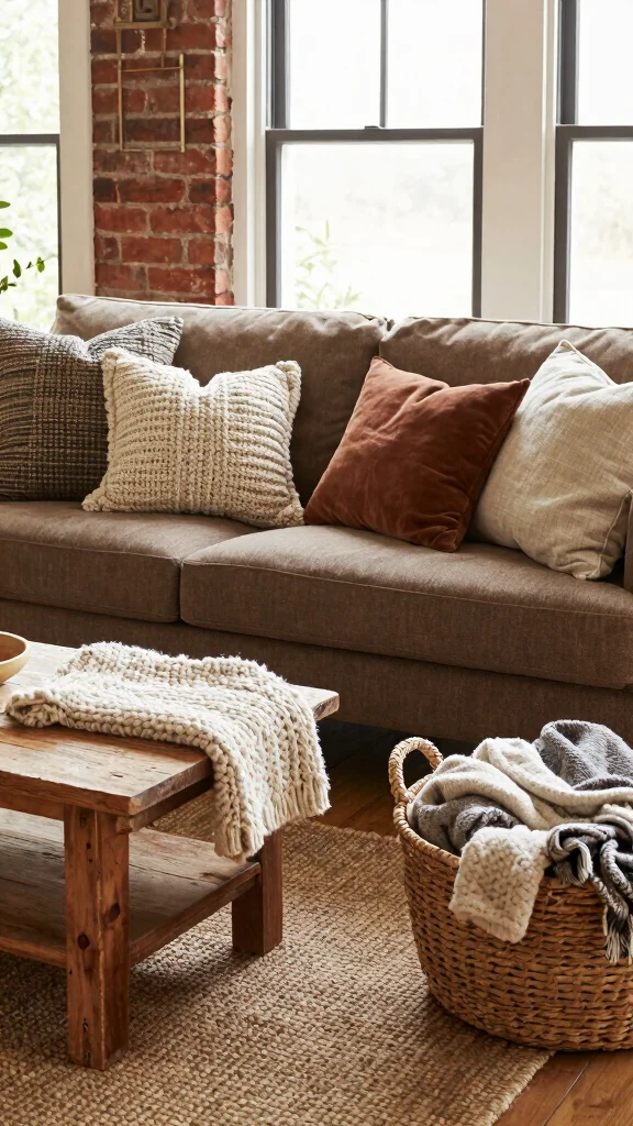 Did you know layering three textures on a brown couch can boost cozy vibes by about 30%? Knit blankets, velvet cushions, and linen pillows in warm beige or soft green transform brown couch living room ideas into a layered, inviting retreat.