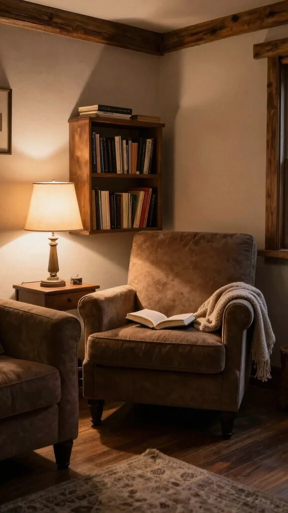 Add a small side table for your coffee or tea while you read. Ensure the area is well-lit with a warm table lamp, and include soft pillows or throws for extra coziness.