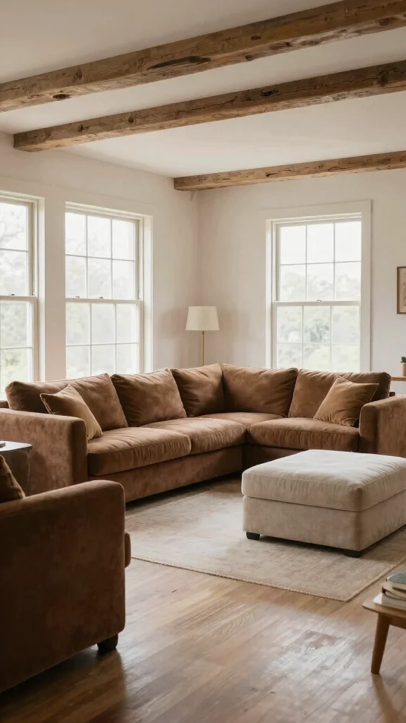 Color schemes are vital in crafting a warm and inviting atmosphere in your living room. With a brown couch as a central feature, earthy tones such as terracotta, sage green, and soft whites can transform the space beautifully. These colors not only enhance a rustic farmhouse vibe but also complement the brown sofa effortlessly.