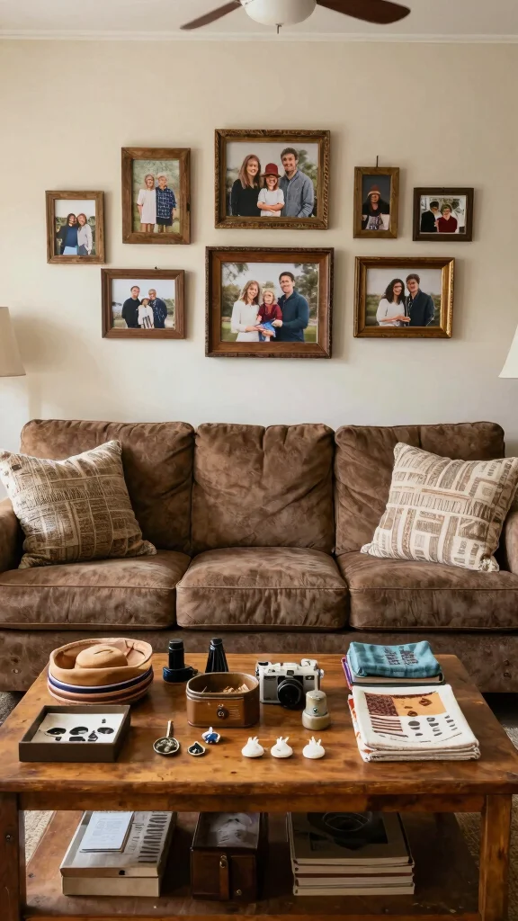 Adding personal touches to your living room decor significantly enhances warmth and charm. Your brown couch can serve as a canvas for showcasing items that tell your story, such as family photos in rustic frames, travel souvenirs, or handmade crafts.