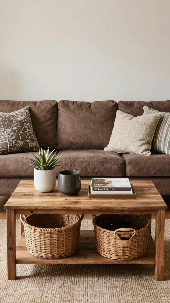 To enhance this aesthetic, consider adding a woven basket beneath the coffee table for extra throws. Pair a rustic wooden coffee table with a sleek metal lamp to balance the textures and materials. This thoughtful layering creates a dynamic visual experience that keeps your living room engaging.