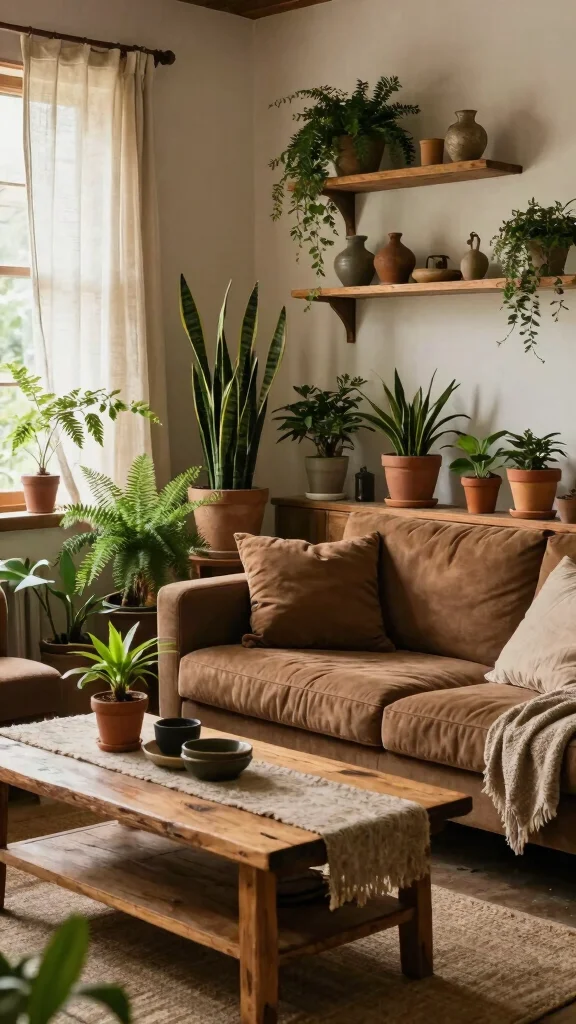 Fun fact: Use 3 earthy tones—terracotta, sage green, and soft whites—to instantly warm a brown couch living room. Pair them with a neutral rug and mossy plants for a rustic, inviting vibe that’s easy to achieve.