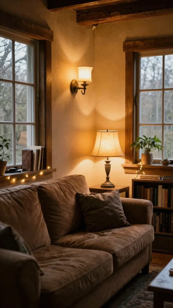 Table lamps with soft, diffused lighting placed beside the brown couch create a lovely reading nook. Wall sconces with a vintage touch add character, while string lights can bring a whimsical vibe when draped creatively around the room.