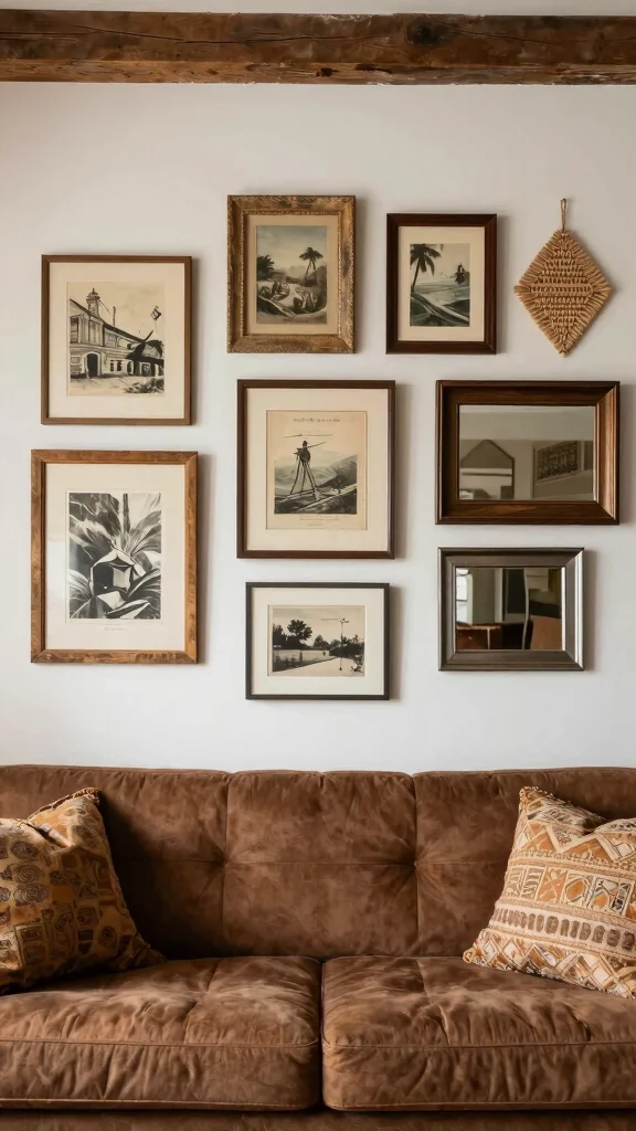 For brown couch living room ideas, start with a gallery wall that blends vintage frames and warm textures. Mix weathered wood and sleek metal, add macrame, and watch light bounce around the room. Practical tip: place larger art at eye level and leave breathing space.