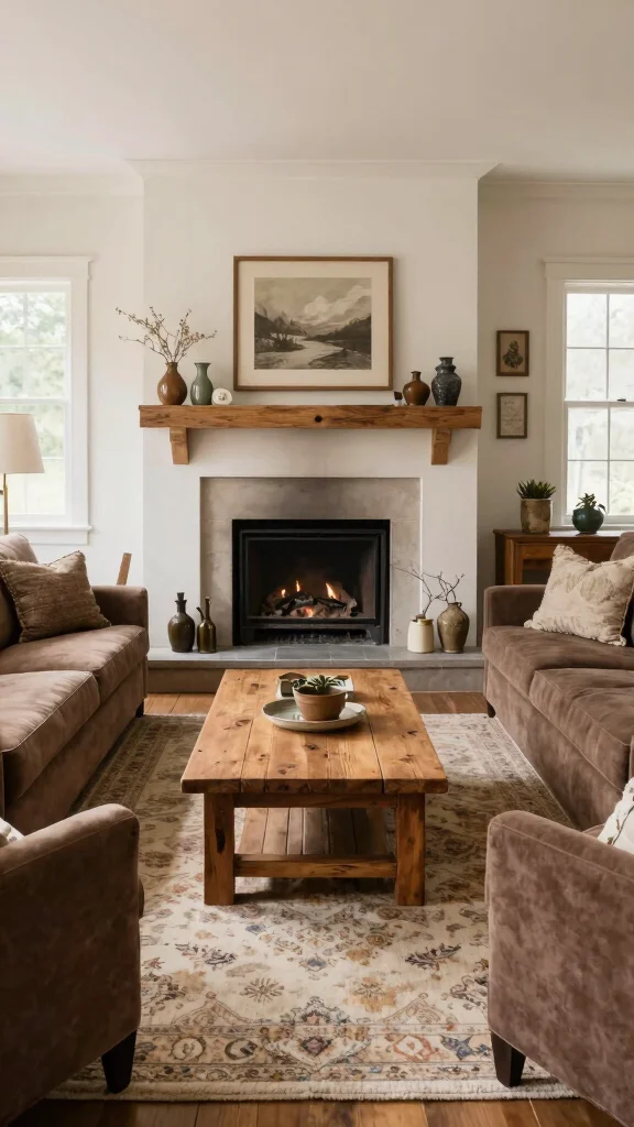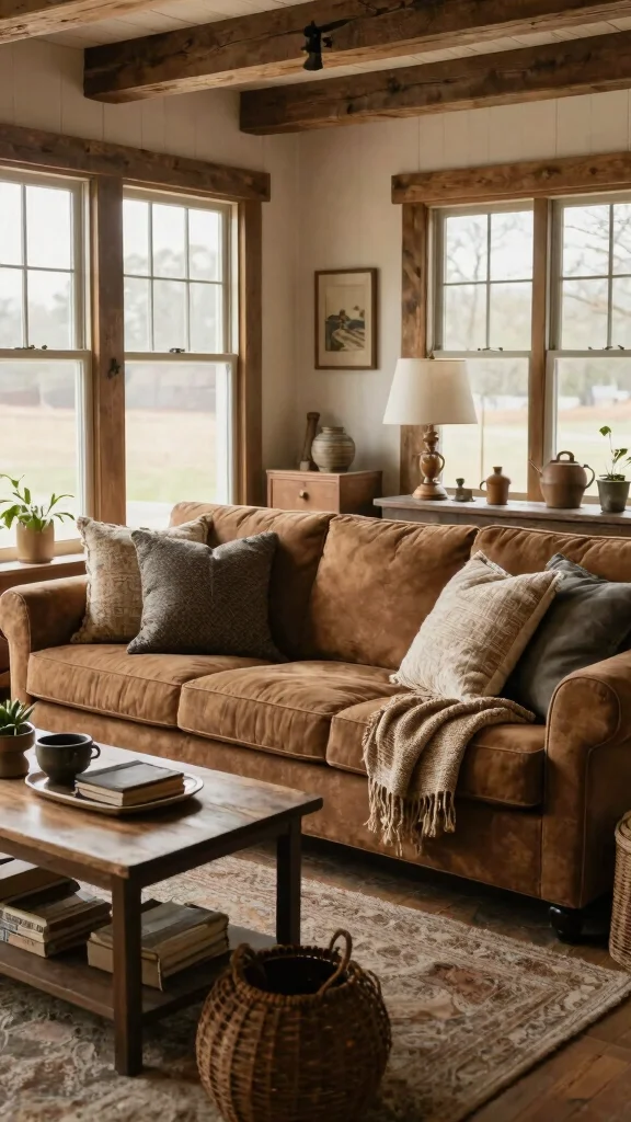 Kick off with a warm neutral palette (creams, taupes, soft grays) so your brown couch living room ideas feel inviting. Let the couch be the anchor and layer in texture with a linen slipcover, chunky knit throws, and a wool or plaid rug. Bring in wood tones with a farmhouse coffee table and vintage accents like woven baskets or distressed signs. Add life with greenery and finish with warm lighting (amber bulbs or warm lampshades). For layout, position the sofa to face a fireplace or feature wall and use furniture arrangement tips to keep seating balanced and conversational. The result is cozy, stylish, and distinctly rustic farmhouse.