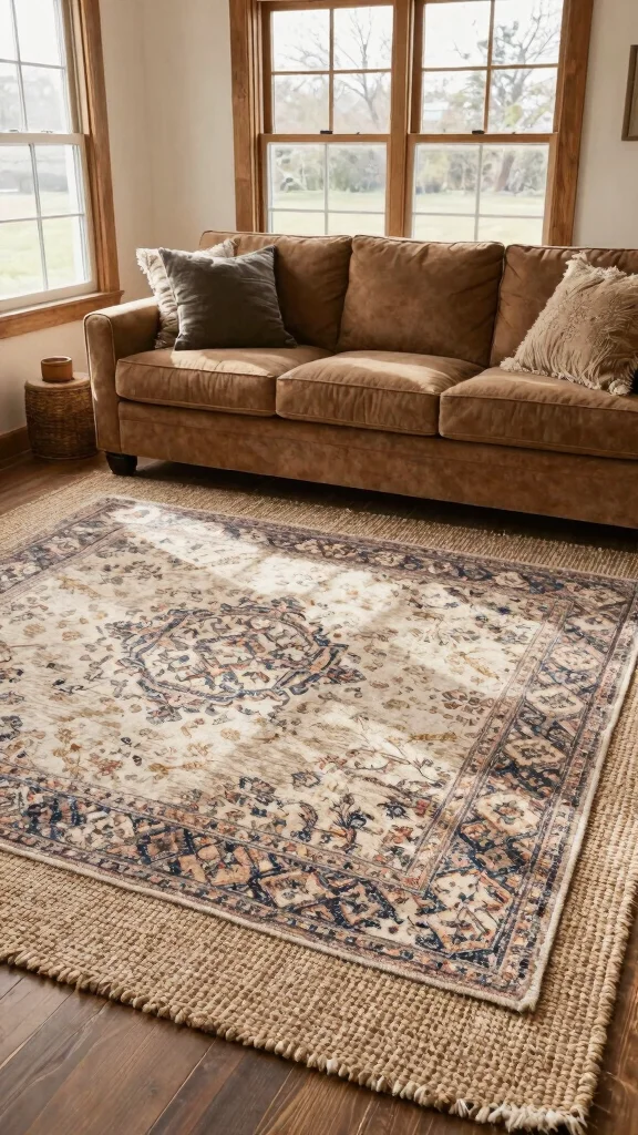 Layering rugs is a creative way to enhance both comfort and style in your living room. Start with a large neutral rug as your base, complementing your brown couch, then layer a smaller patterned or textured rug on top for added interest.
