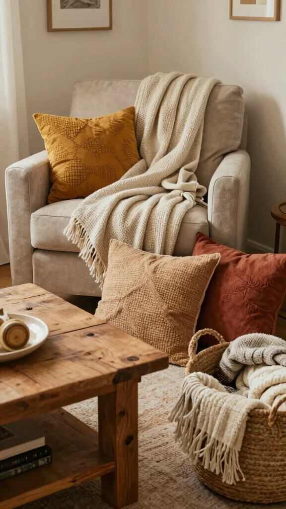 Layering different textures and patterns in your throws and pillows will create visual interest and comfort. Additionally, using baskets made from natural fibers for storage can add warmth while keeping things organized.