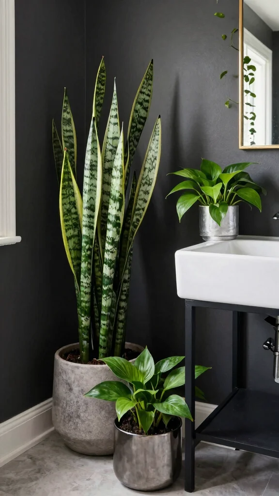 Adding plants to your dark bathroom introduces a refreshing touch of nature and warmth. Choose plants that thrive in humidity and low light, like snake plants or peace lilies. These greens provide a beautiful contrast to darker tones while enhancing the luxurious feel of the space. Stylish pots in matte or metallic finishes can further elevate your decor.