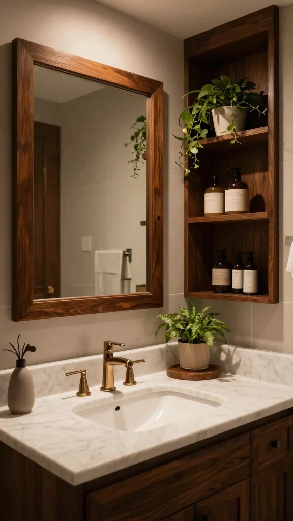 Incorporate wooden shelving or a dark wood vanity for added functionality and flow in the room. These features create a seamless blend of style and practicality, enhancing your space’s overall design.