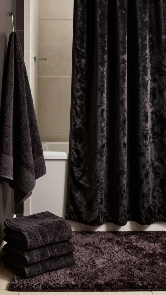 Textiles are integral to enhancing the mood and luxury of your bathroom. Soft, plush towels in darker shades harmonize beautifully with your color scheme, adding warmth and comfort. Velvet or silk shower curtains can elevate the sophistication of the space while being practical. Layering in a soft area rug in dark tones provides a comforting touch underfoot, completing the inviting atmosphere.
