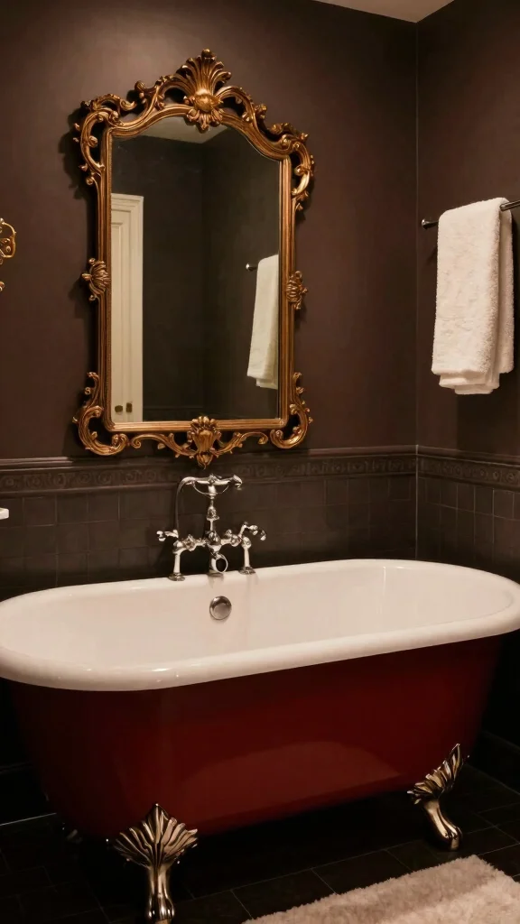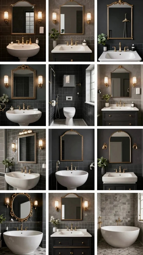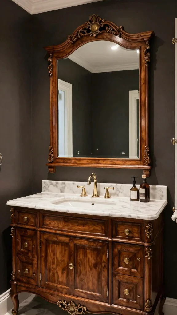 Infusing vintage elements into your dark bathroom design adds timeless charm and character. Look for antique mirrors, vintage faucets, or unique glassware that can enrich the space’s aesthetic. Mixing old and new creates a beautifully curated look that feels rich in history and style. Vintage pieces can enhance your overall theme, echoing the elegance often found in classic designs.