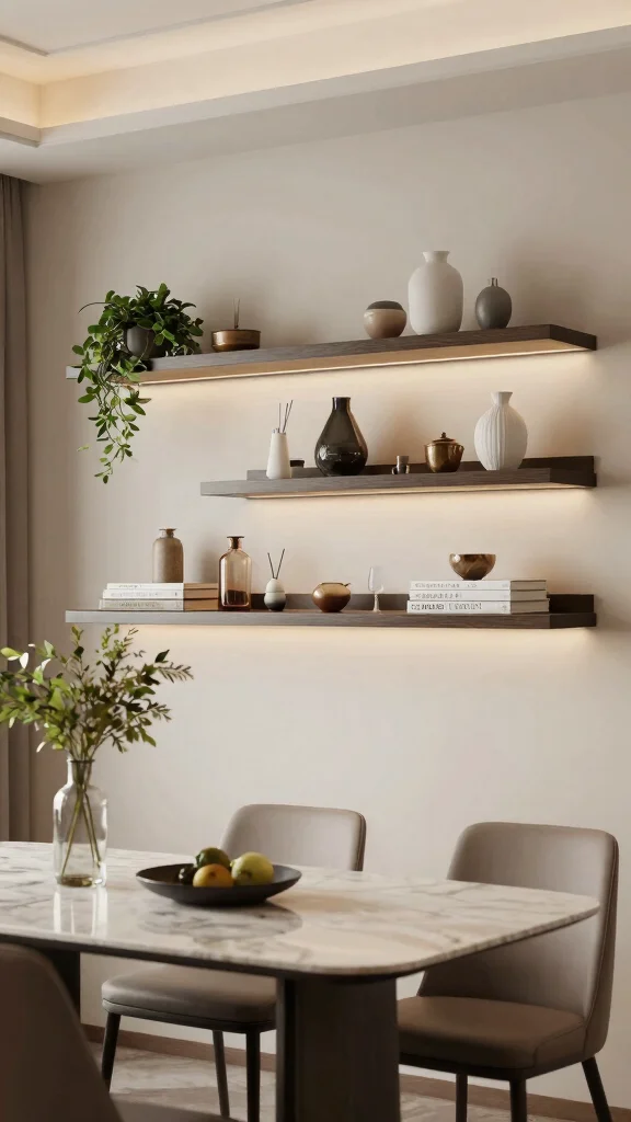 Floating shelves create visual interest and offer extra storage, allowing you to showcase items without taking up floor space. Regularly switch out decor to keep your dining area feeling fresh and on-trend.