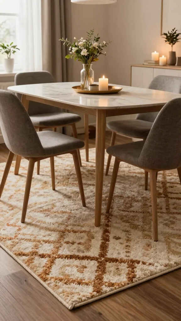 Choose a compact rug that anchors the table without overwhelming the room, and pick interior design tips that connect with dining room design and living room decor for a cohesive look.