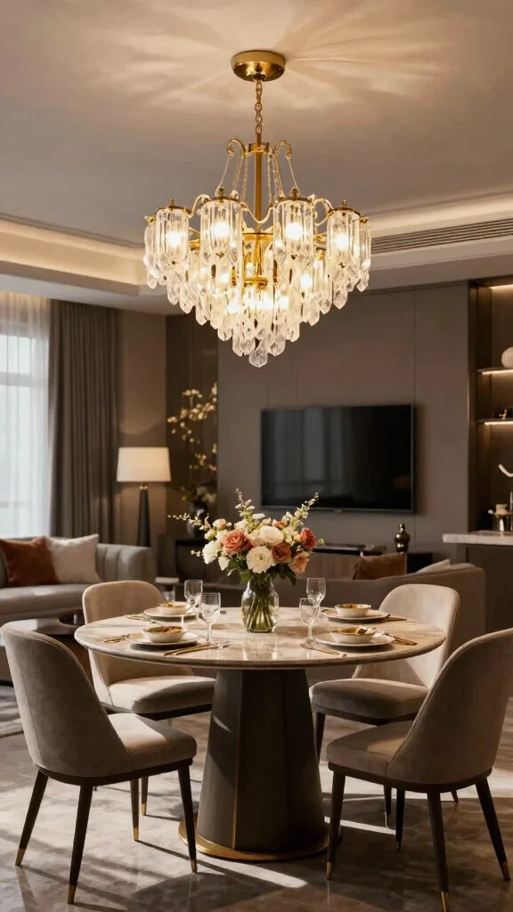Elevate your dining experience with a statement light fixture that draws attention and adds character to your space. A large pendant or chandelier can serve as a stunning focal point, enhancing the overall ambiance of your living area.