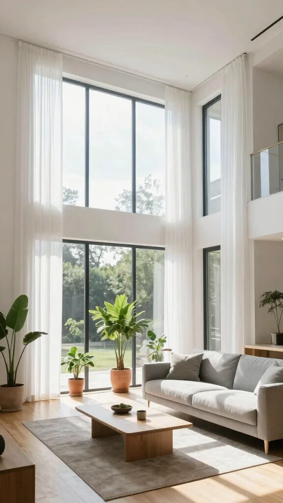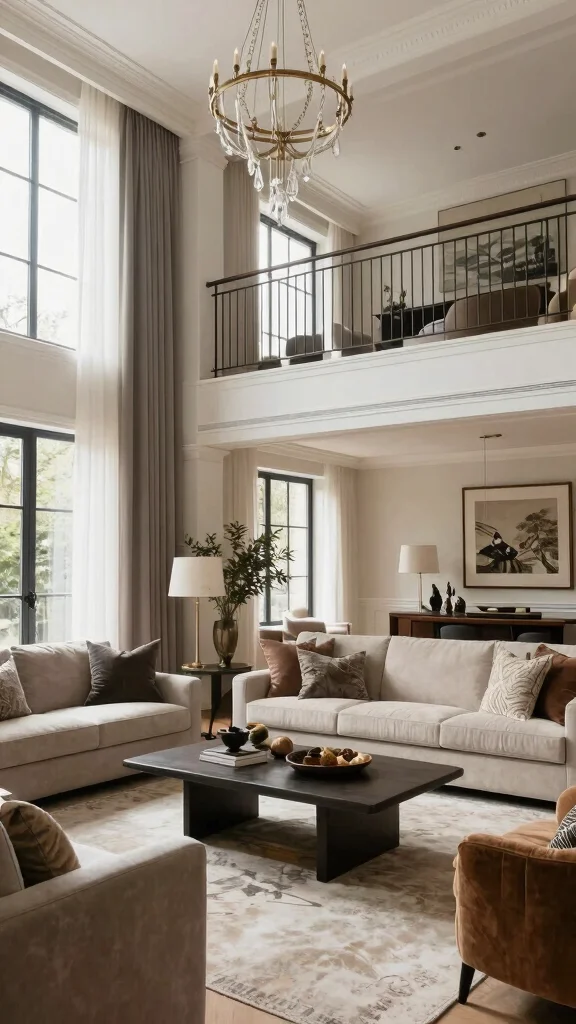 Begin with a light, cohesive palette that runs from floor to ceiling to keep the space feeling expansive. Use vertical elements—tall art, floor-to-ceiling curtains, and slim furniture silhouettes—to emphasize height without crowding. Add a dramatic pendant or chandelier sized for the space to create a focal point in your double height living room. Let in as much natural light as possible and use reflective surfaces or glass to bounce it around, which supports airy room decor and the vibe of a high ceiling living room.