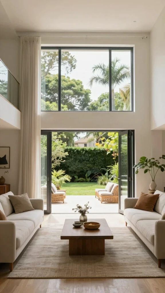 Blending indoor and outdoor spaces can significantly enhance the feeling of airiness in your home. In a double height living room, large sliding or folding glass doors create a seamless connection to patios or gardens, inviting nature inside. This design not only brings in natural light but also allows fresh air and beautiful views of greenery to flow into your room.