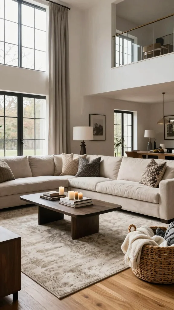Prioritize comfort by using plush seating, soft textiles, and layered textures that invite lingering. Choose furniture with commanding presence but maintain scale so the room doesn’t feel empty—pair a statement sofa with intimate love seats around a large coffee table for spacious living space. Add warm wood tones, textiles, and a few carefully chosen accessories to create a cozy contrast against the dramatic height and airy room decor.