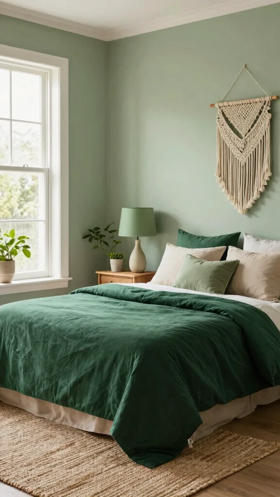 What are some beginner-friendly green bedroom ideas to create a calm, peaceful space?