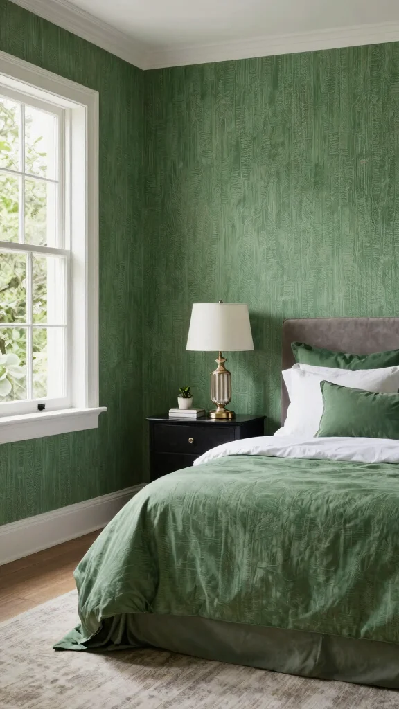 Textured wallpaper can be a game changer in your green bedroom, adding depth and sophistication. Opt for subtle patterns or natural textures like grasscloth in shades of green to create an elegant backdrop without overwhelming the space. This choice not only enhances the visual appeal but also invites warmth into the room.