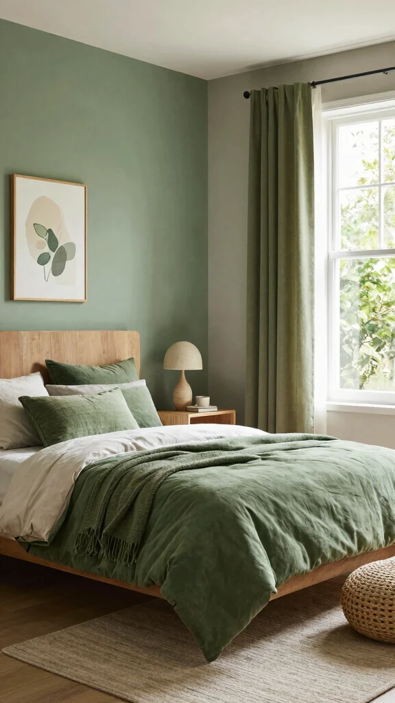 Start with a soft green palette (sage, moss, and olive) as your base for green bedroom ideas that feel restful.
