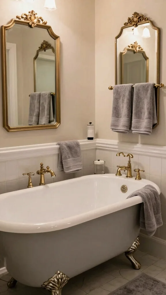 To achieve this ambiance, incorporate vintage fixtures like a classic clawfoot tub in a soft grey finish. Antique-style mirrors and light fixtures provide an elegant touch that enhances the overall design.