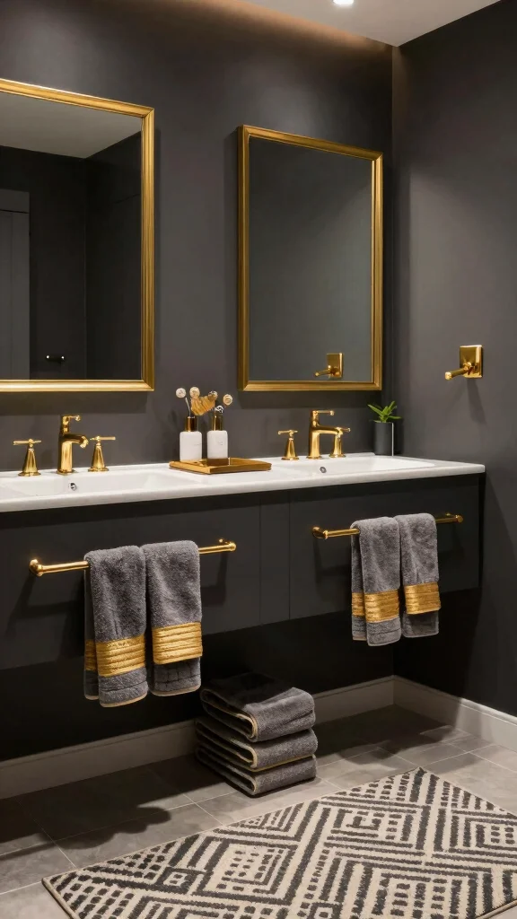 For practical execution, deep charcoal walls or tiles create a bold foundation. Look for budget-friendly gold fixtures at discount stores to add a touch of glamour without breaking the bank.
