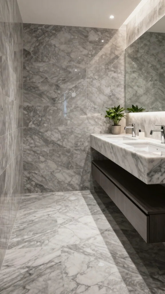 For practical application, consider grey marble tiles for flooring or walls to create a cohesive look. Simple accessories allow the beauty of the marble to shine while remaining budget-friendly.