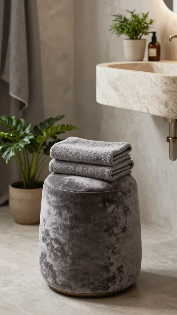 For practical implementation, consider a plush grey velvet stool or ottoman for seating, along with textured towels that contrast with smooth surfaces. These elements can elevate the overall aesthetic without significant investment.